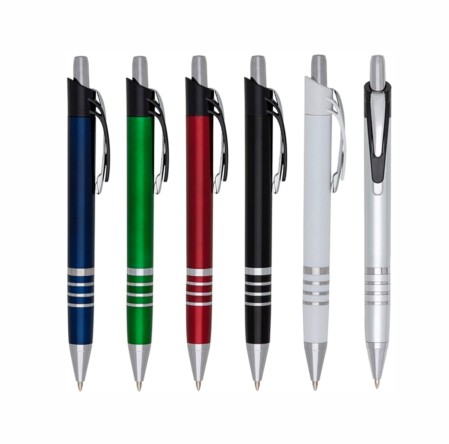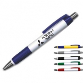 Caneta plástica corpo branco com detalhes coloridos. Clip plástico e detalhe inferior emborrachado com relevo, acionador e ponteira prateada (plástico). Aciona por clique.